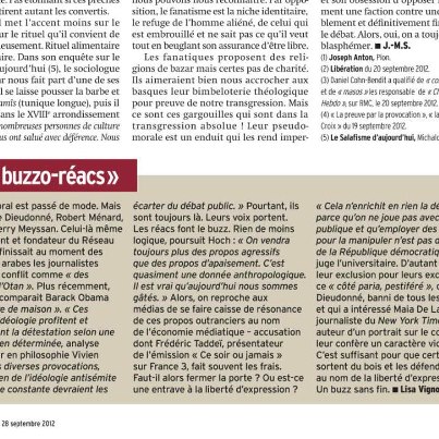 Dans le Marianne de cette semaine : les « buzzo-réacs » 22 samedi Sep 2012 Posted by Vivien Hoch in Religion ≈ Poster un commentaire Partager : Partager sur X(ouvre dans une nouvelle fenêtre) X Partager sur Facebook(ouvre dans une nouvelle fenêtre) Facebook J’aime chargement…